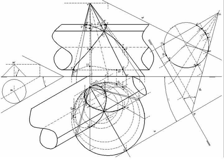 · Cono oblicuo de directriz circular situada en el PH. de proyección, centro el punto O, radio 6'5 ud. y vértice V, que tiene la generatriz opuesta a la generatriz de tangencia con el plano W, vertical. · Superficie cilíndrica de revolución, de 4 ud. de radio y generatrices horizontales, que tiene la generatriz de tangencia con el W en la cota + 8 ud.